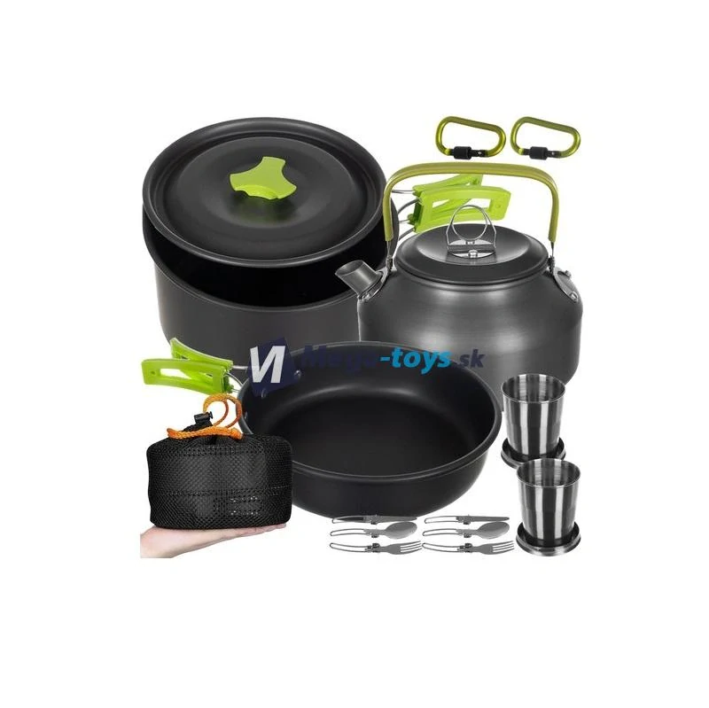 MNOHO PRVKOV V SADE - sada kuchynského riadu obsahuje mnoho prvkov, vrátane hrnca, kanvice, panvice, 2x nôž, vidlička, skladacia lyžica, 2x karabína, 2x skladací hrnček, úložné vrecko. Sada obsahuje aj vrecká na príbory.