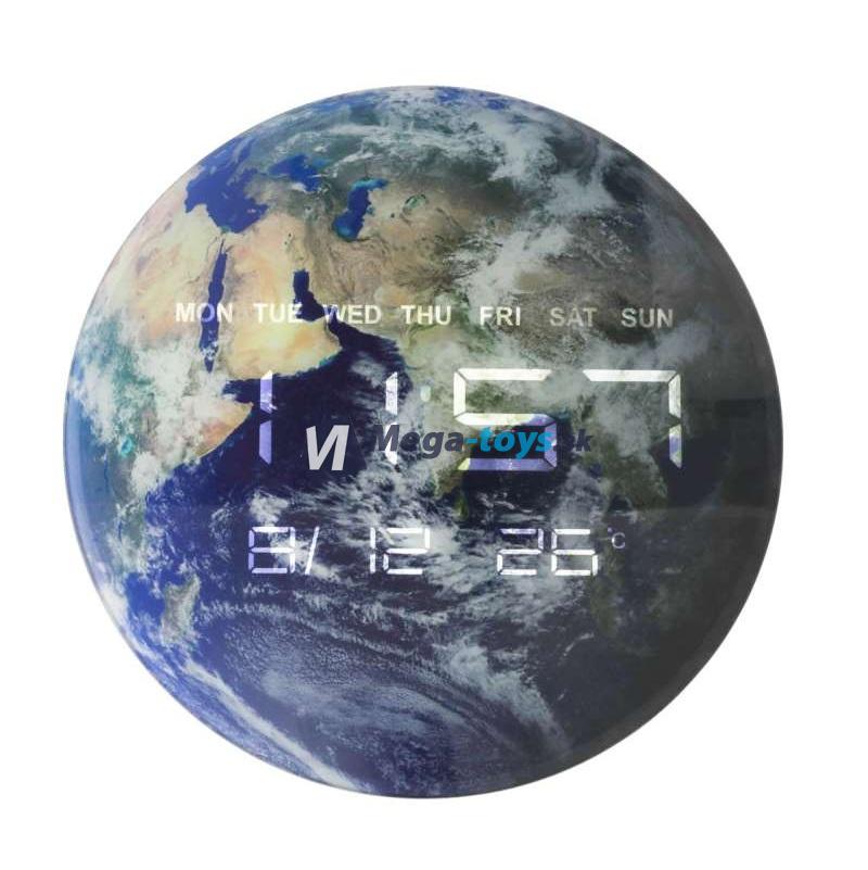 Hodiny nemusia byť nudné - a tieto rozhodne vynikajú! Grafika zeme priťahuje pozornosť a robí z tohto funkčného zariadenia jedinečný doplnok interiéru. Elektronický displej poskytuje informácie, ako sú: presný čas (12/24 h), dátum (M/D/Y), deň v týždni (v angličtine) a aktuálna teplota v miestnosti. Po nastavení hodín bude značka dňa v týždni nepretržite blikať. Hodiny je možné zavesiť na stenu alebo umiestniť na priložené stojany. Hodiny musia byť vždy pripojené k zdroju napájania (napájací kábel je súčasťou dodávky). Batéria CR3023 (je súčasťou dodávky) uchováva uložené údaje v prípade dočasného výpadku napájania.