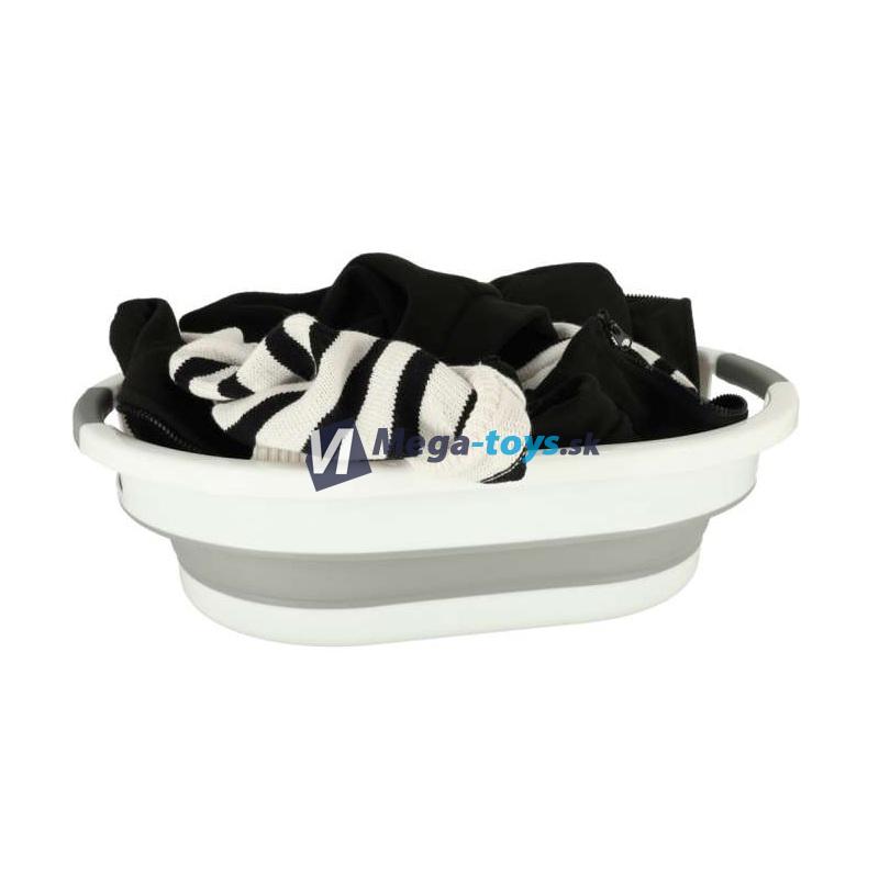 Skladací kôš na bielizeň. Vyrobený z plastu a silikónu , takže sa dá zložiť a uskladniť, keď sa nepoužíva. Má dve rukoväte na pohodlné prenášanie. Celkový objem je 25 litrov .