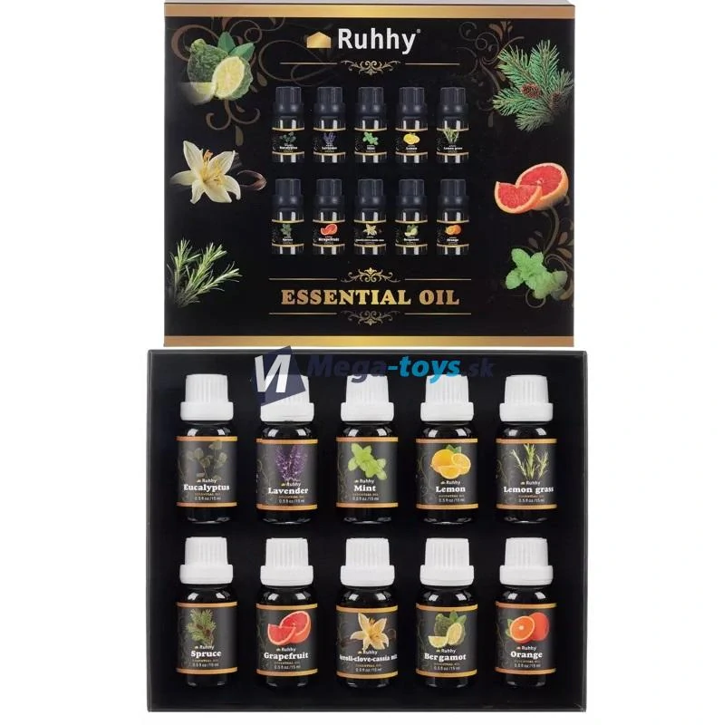 10 RÔZNYCH VÔNÍ – celá sada má 10 rôznych vôní ako napr.: eukalyptus, pomaranč, mäta, levanduľa, borovica, citrón, lekno, grapefruit, citrónová tráva, bergamot. Všetky oleje sú uzavreté vo fľaštičkách s objemom 15 ml.